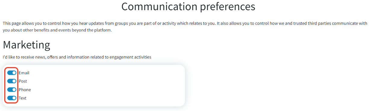 From this section, you can manage how you receive updates from the groups you're involved in or activities that concern you by toggling the highlighted buttons below to either on or off.