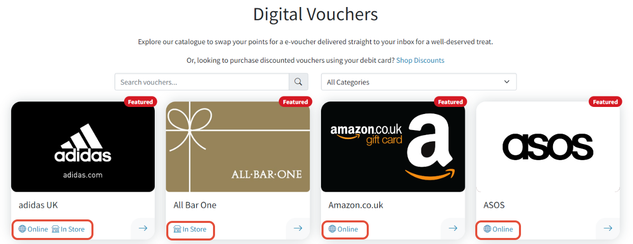 Before choosing a voucher, you’ll see icons beneath each option indicating where it can be spent - such as online, in-store, or both.