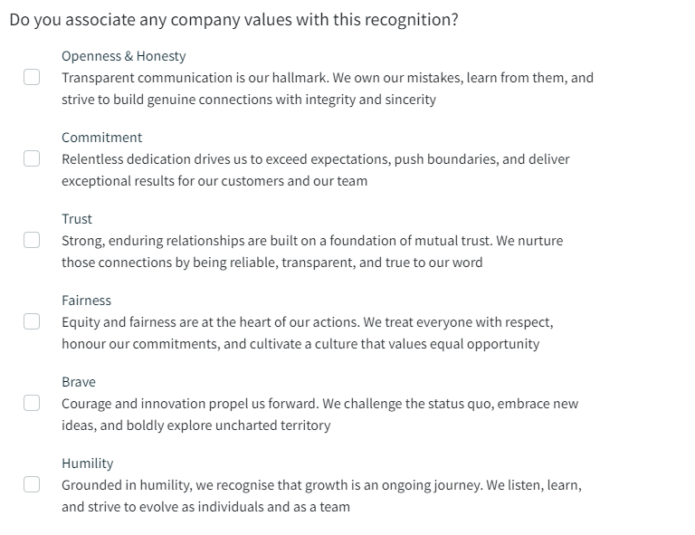 Link recognitions and nominations to your company values, bringing them to life and reinforcing their importance. This alignment helps to create a strong sense of purpose and shared vision among your employees.